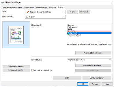 Indstillingen i [Målsætning] er muligvis ikke velegnet til CAD-udskrivning.
