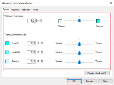 Kohdassa [Tummuuden hienosäätö] voidaan säätää väriaineen tummuutta jokaista tummuustasoa varten.