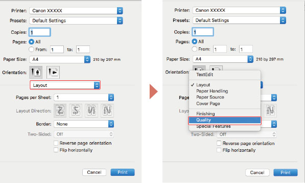 [Printer Features] may be displayed in the pop-up menu, depending on the application you are using. In this case, switch [Feature Sets] on the [Printer Features] panel to display the items to set.