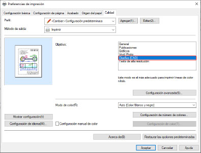 Es posible que el ajuste de [Objetivo] no sea adecuado para la impresión CAD.