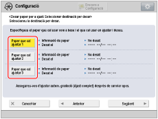 Seleccioneu el calaix del paper en què el paper que heu registrat com a paper per al calibratge s'ha carregat com a origen del paper carregat amb paper personalitzat que s'utilitzarà com el tipus de paper que s'ha d'ajustar.