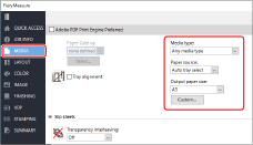 Especifiqueu un nom, un tipus i una mida del paper i, a continuació, seleccioneu el perfil d'impressió que heu establert al pas 11 per a [Front Color Profile].
