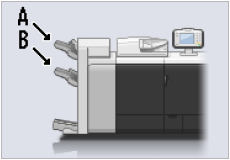 Hvis du indstiller tilstanden Stor papirstak til "Til", vil rækkefølgen af bakker, hvortil der printes, være fast. Når du f.eks. printer et job til bakke A og B på Finisher-AN med tilstanden Stor papirstak "Til", stables printene først på bakke B, og når bakke B har nået sin kapacitet, stables det printede papir på bakke A. Du kan forbedre produktiviteten ved at stille Stor papirstak til "Til" og bruge bakke B først. Se følgende for at få flere oplysninger om tilstanden Stor papirstak.