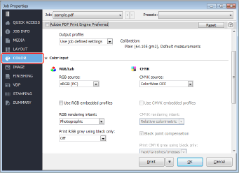 Hvis du vælger [Bypass conversion] i [CMYK source], bruges printprofilen ikke. Der anvendes kun en kalibreringsindstilling, der er knyttet til den valgte printprofil.