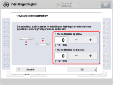 Denne funktion kan påvirke, hvordan papir fremføres. Da forøgelse af værdien i stor grad kan forårsage papirstop, anbefaler vi, at du justerer værdierne i små trin.