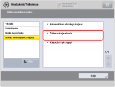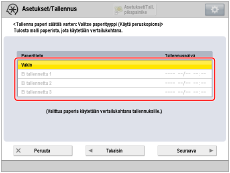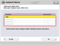 Valitse paperikasetti, johon kalibroitavaksi tallentamasi paperi on asetettu paperilähteeksi, johon on lisätty mukautettua paperia ja jota käytetään säädettävänä paperityyppinä.
