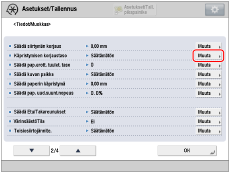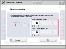*2: Kun tulostat kaksipuolisesti, painikkeen [-] tai [+] painaminen asetuksen [Luovutusteksti alas (Tav.)] kohdalla ei toimi paperin käpristymän korjaustason säätämiseksi.