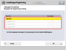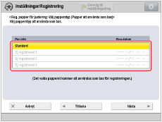 ”Inställningar/Registrering” > ”Inställningar” > ”Pappersinställningar” > ”Registrera pappersformat och -typ för en papperskälla” i Användarhandbok
