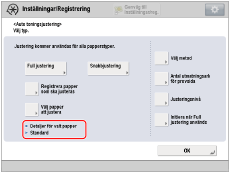 Välj den papperslåda där pappret som du har registrerat som papper för kalibrering har fyllts på som papperskälla. Den har fyllts på med anpassat papper som ska användas som papperstype för justering.