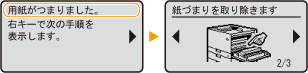 紙がつまると、ピーという警告音が鳴り、画面に<用紙がつまりました。>というメッセージが表示されます。