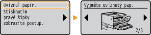 Pokud dojde k deformaci papíru, ozve se zvukový alarm a na obrazovce se objeví zpráva <Uvíznul papír.>. Stisknutím tlačítka
