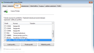 Jos laitteen IP-osoite on vaihdettu tai jos ajuria asennettaessa on valittu väärä portti, lisää uusi portti.