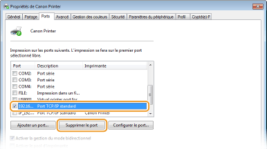 Vous ne pouvez pas supprimer un port en cours d'utilisation. Pour supprimer un port en cours d'utilisation, sélectionnez un nouveau port à utiliser sur l'appareil