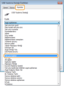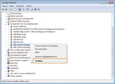 [USB Yazdırma Desteği] öğesine sağ tıklayın ve [Özellikler] öğesine tıklayın.