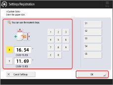 → <Preferences> → <Paper Settings> → <Paper Settings> → select the paper source that contains the paper to be actually measured for its size → enter the measured value for <Custom Size>.