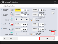 To obtain a highly precise correction result easily, set the number of output test pages to one, complete the adjustment, and then adjust <Front Side> and <Back Side> of <Lead Edge (e) Alignment>. These settings and adjustments allow you to obtain a correction result similar to that obtained by scanning multiple test pages.