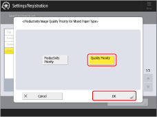 → <Function Settings> → <Common> → <Print Settings> → <Productivity/Image Qlty. Priority for Mixed Paper Type> → <Quality Priority>.