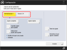 Seleccione <Estándar> (para el papel recomendado) o el papel para la calibración que ha cargado en el paso 1 de <Seleccionar papel para ajustar>.
