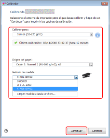 En esta sección se explica cómo realizar la calibración para el tipo de papel que va a utilizar mediante el uso de un espectrofotómetro manual (X-Rite i1 Pro 2). Es necesario conectar el espectrofotómetro al equipo en el que se haya instalado Command WorkStation. Puede imprimir con mayor precisión vinculando el ajuste de calibración para el tipo de papel con el perfil de salida en uso.