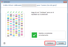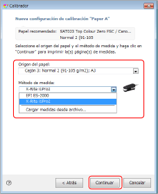 En esta sección se explica cómo calibrar para "Canon Top Colour Zero FSC (100 g/m2)" utilizando un espectrofotómetro manual (X-Rite i1 Pro 2). Es necesario conectar el espectrofotómetro al equipo en el que se haya instalado Command WorkStation. Tenga en cuenta que al hacer estas operaciones sobrescribirá cualquier valor de calibración que haya guardado.
