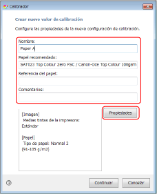 Haga clic en [Propiedades] para abrir la ficha [PAPEL]. Compruebe los ajustes en [Origen del papel], [Tipo de papel], y [Tamaño de papel de salida] para comprobar si son adecuados para el papel con el cual se imprime la calibración.
