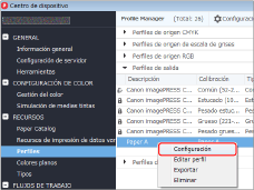 Haga clic con el botón derecho en el perfil de salida para el papel que esté utilizando, y haga clic en [Configuración].