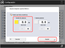 → <Preferencias> → <Opciones de papel> → <Opciones de gestión de tipos de papel> → seleccione el tipo de papel que está utilizando y que tiene este problema → pulse <Detalles/ Editar> → <Cambiar> para <Ajustar márgenes sup./inf.> → ajuste el valor de <Borde de cabecera> hacia el extremo positivo.