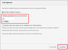 Cambie el número en [Trabajos guardados en la cola Impresos:] y haga clic en [Guardar].