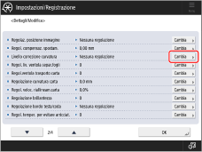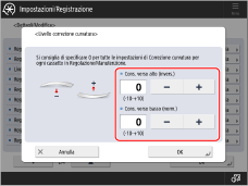 Premere <-> o <+> per <Cons. verso alto (invers.)> o <Cons. verso basso (norm.)> per regolare il livello di correzione della curvatura della carta → <OK>.