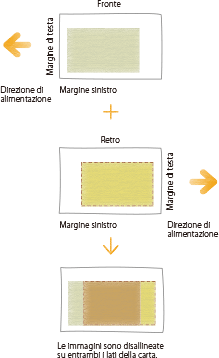 La macchina decide la posizione di inizio della stampa in base al bordo di testa della carta. Dopo aver stampato il lato anteriore della carta, la carta viene invertita e viene stampato il lato posteriore, a partire dal margine di coda. Per questo motivo la posizione di inizio della stampa potrebbe essere leggermente differente su lati opposti della carta.