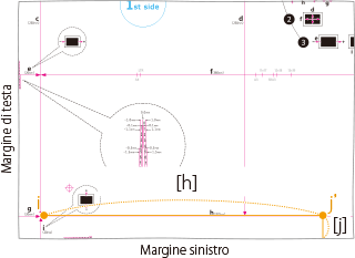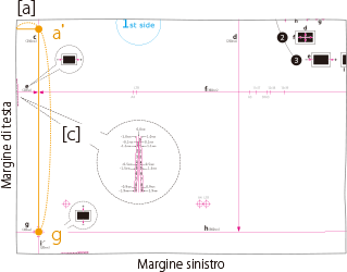 Se la pagina di test è così piccola che "a" non si trova sulla pagina, aggiungere un marchio arbitrario "a'" sulla linea rossa "c". Immettere la distanza da "a'" al bordo di testa della carta in [a]. Immettere la distanza da "g" a "a'" in [c].