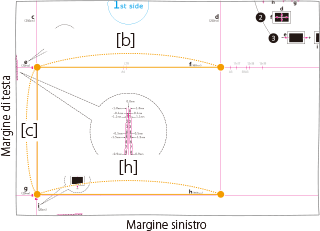 Se la pagina di test è così piccola che le distanze b e h non possono essere misurate, aggiungere "c'", "b'" e "h'" come illustrato a destra. Immettere queste distanze in [c], [b] e [h] rispettivamente.