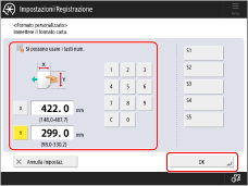 → <Preferenze> → <Impostazioni carta> → <Impostazioni carta> → selezionare la fonte alimentazione carta che contiene la carta da misurare effettivamente per le sue dimensioni → inserire il valore misurato per <Formato personalizzato>.