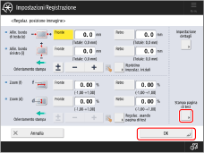 → <Preferenze> → <Impostazioni carta> → <Impostazioni gestione tipo di carta> → selezionare la marca di carta in cui l'immagine è disallineata → premere <Dettagli/ Modifica> → <Cambia> per <Regolaz. posizione immagine>.