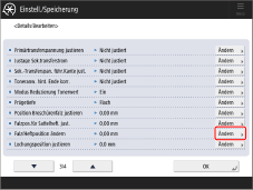 Wählen Sie den Papiertyp, den Sie bearbeiten möchten, aus der Liste aus → berühren Sie die Taste <Details/ Bearbeiten> → <Ändern> unter <Falzposition für Sattelheftung justieren>.