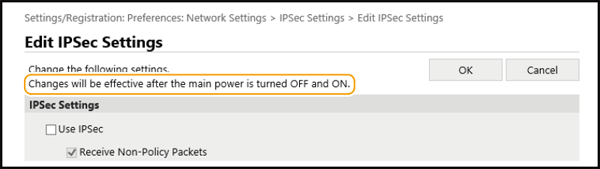 After the message "Changes will be effective after the main power is turned OFF and ON." is displayed, turn off the machine, and then turn on the machine after 10 seconds.