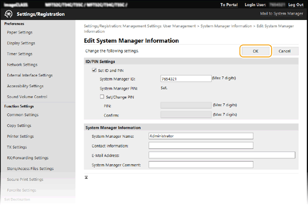 Select [System Manager Mode], enter the [System Manager ID] and [System Manager PIN], and then click [Log In].
