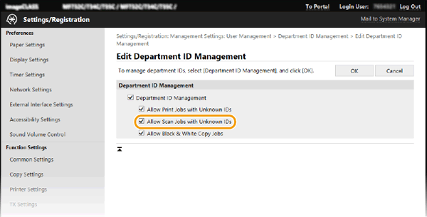 Start the Remote UI and log in to Administrator Mode [Settings/Registration] [User Management] [Department ID Management] [Edit] Select [Allow Scan Jobs with Unknown IDs] [OK]![]() |
