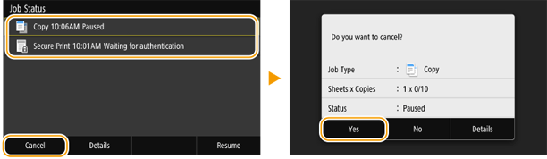 Select the document you want to cancel in the <Copy/Print Job Status> tab