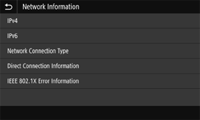 Displays the network settings such as the IP address of the machine and status such as the condition of wireless LAN communications.