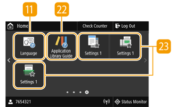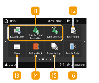 The Home screen or settings screen appears on the display, allowing you to initiate functions such as copy and scan. You can also use the display to check information such as error messages and the machine's operation status. The screen is also a touch panel, so you can perform operations by touching the screen directly.