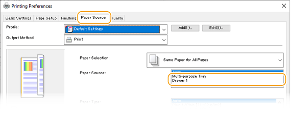 In the [Paper Source] tab, select the paper source where the preprinted paper is loaded in [Paper Source].