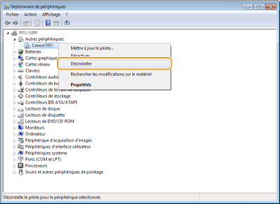 Cliquer avec le bouton droit sur [Périphérique inconnu] et cliquez sur [Désinstaller].