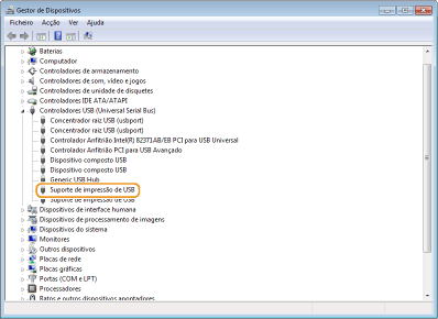 Verifique se [Suporte de impressão de USB] é apresentado no Gestor de Dispositivos.