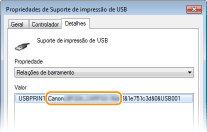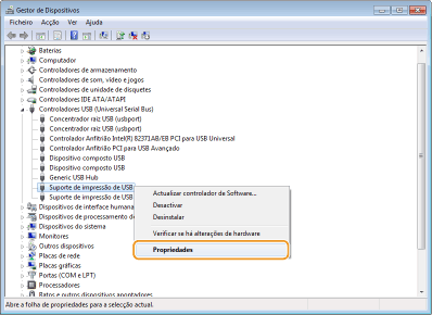 Clique com o botão direito do rato em [Suporte de impressão de USB] e clique em [Propriedades].
