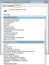 Abra [Controladores USB (Universal Serial Bus)] e verifique se [Suporte de impressão de USB] é apresentado.