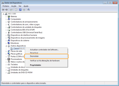 Clique com o botão direito do rato em [Dispositivo desconhecido] e clique em [Desinstalar].