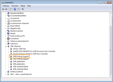 Tarkista, näkyykö [USB Printing Support] laitehallinnassa.
