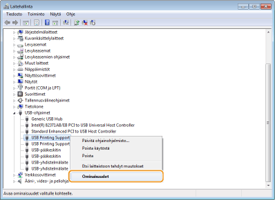 Napsauta hiiren kakkospainikkeella [USB Printing Support] ja valitse [Ominaisuudet].