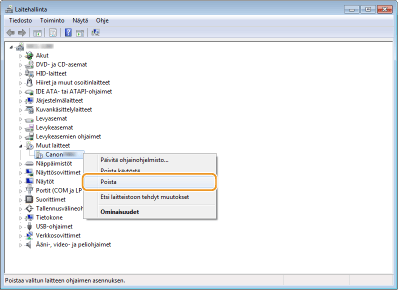 Napsauta hiiren kakkospainikkeella [Tuntematon laite] ja valitse [Poista asennus].